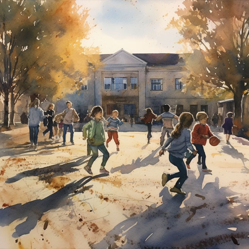 “Watercolor students on brake playing in the schoolyard” Midjourney
